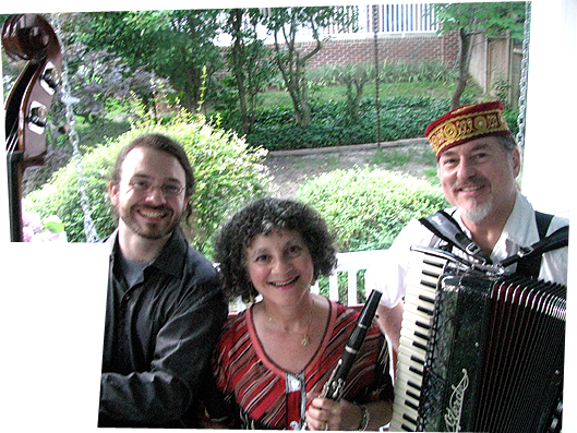 is one of the most popular klezmer bands in North Carolina. The core trio, formed in Durham, North Carolina, in 1998, features Riki Friedman on clarinet, Mike McQuown on accordion, and Stewart Aull on string bass. Karen Kumin sings with the group whenever Yiddish songs are requested. They have performed klezmer music together at countless concerts, weddings, bar & bat mitzvahs, and Jewish community celebrations throughout N.C. and surrounding states. This is the group to hire if you want joyful dancing at your simkhe.